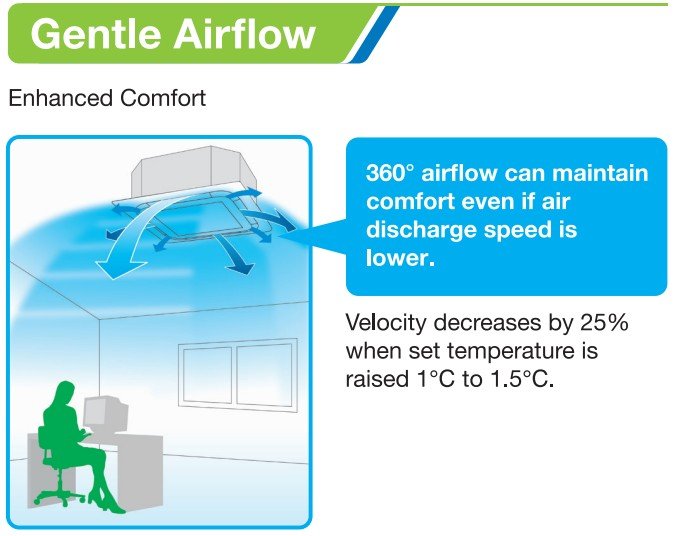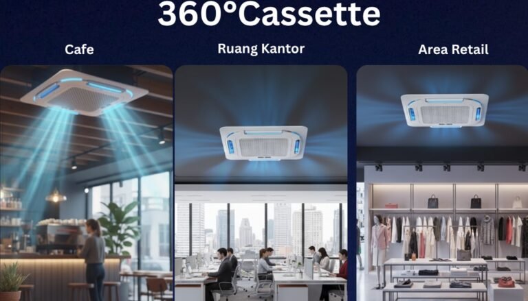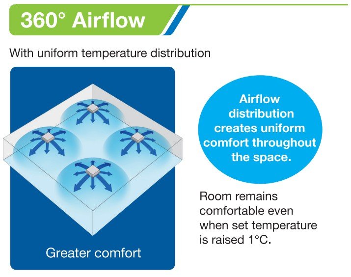 AC Cassette dengan Hembusan Udara 360° Air Flow cocok digunakan untuk ruang komersial seperti Cafe, Ruangan Kantor dan Toko Retail. Aliran udara lebih merata dan estetika ruangan tetap terjaga